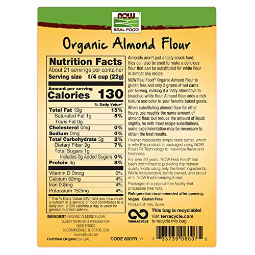 Almonds aren’t just a tasty snack food; they can also be used to make a delicious flour that can be substituted for white flour in almost any recipe. Now Real Food Organic Almond flour is gluten free and only 3 grams of net carbs per serving, making it a tasty alternative to bleached white flour. Almond flour adds a rich texture and color to your favorite baked goods.